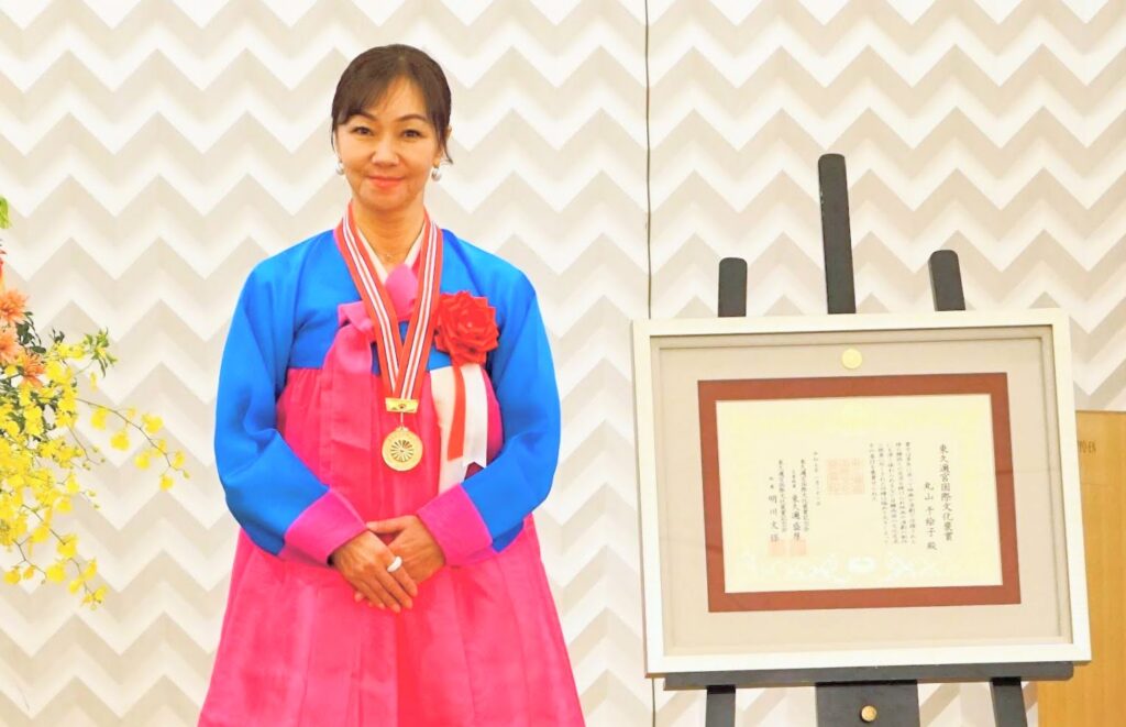 丸山様は、かつて千葉真一氏が設立したJACジャパンアクションクラブに所属され、志穂美悦子氏や真田広之氏とともにテレビや映画そして舞台で活躍されました。その後も、振付師やフィットネスインストラクターとして活動する傍ら、韓国との交流に尽力され、韓国映画のプロデュースや、K-POPを用いたフィットネスを考案されるなど、日韓両国において、様々な分野でご活躍されています。